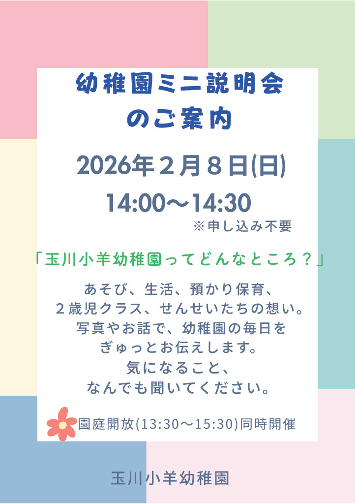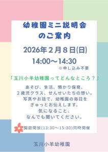 玉川小羊幼稚園では、2月8日(日)午後に幼稚園ミニ説明会を開催することになりました!