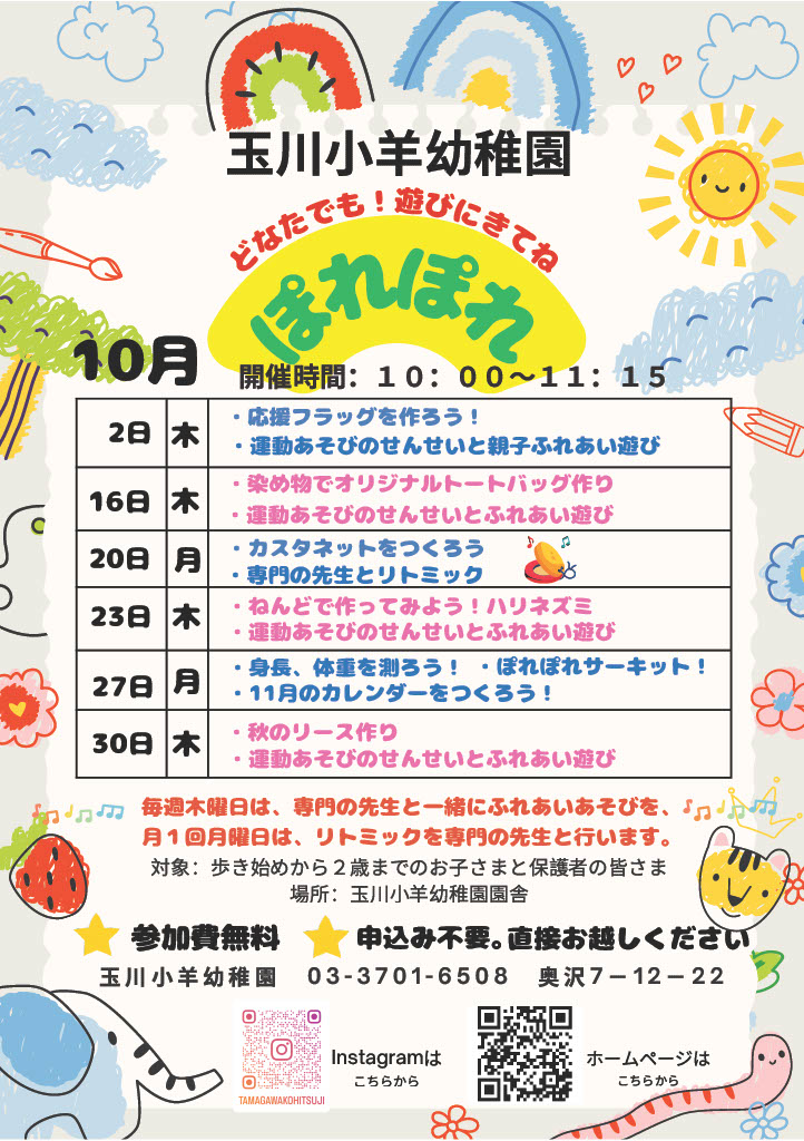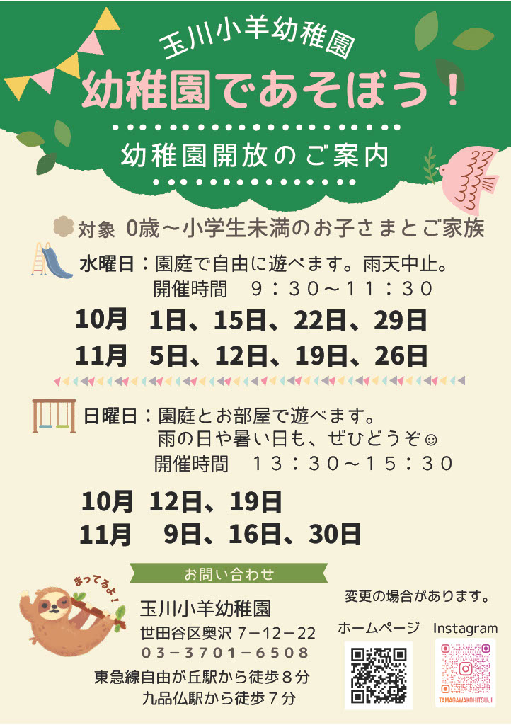 【園庭開放!子育てサークル!など、10月からの日程】玉川小羊幼稚園 地域子育て支援のご案内