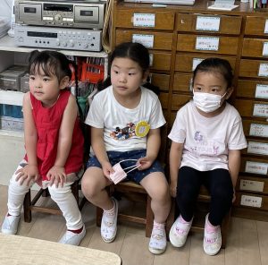 5月の最後は、みんなで防災引き取り訓練をしたね。もし地震が来たら、みんながどうしたら良いのか覚えてほしくて逃げる練習をしたね。それから、ホールに入って、ママたちが迎えに来てくれるまで先生と手遊びして待ったね。みんな良くできてとっても良かったよ。本当の時は、いっぱい待たなければいけないかもよ・・・。だから、アメをなめて待つ練習もしたんだね。
