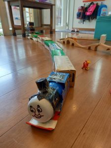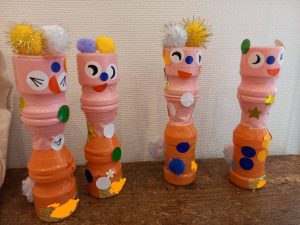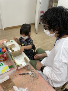 マラカスは、自分たちで中身を入れて、顔シールを貼り付け、みんなそれぞれ違った味わいの作品になりました。マラカスは、🎵公園へ行きましょう🎵の音楽に乗せて演奏もしましたよ。