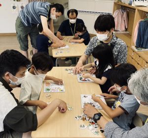 年少は「ジャンプ・カエル🐸」、年中は「ビー玉迷路」。そして、年長は「本邦初めてのパパと子どもの人間すごろく」だったね。