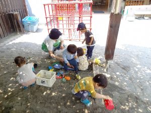 【5月】お部屋のおもちゃ、幼稚園の園庭、ダンゴムシに蝶々、子ども達にとって見るもの全てが興味津々です。5月は天気に恵まれ、おやつ時間もテラスで”青空おやつ”。爽やかな風の中、のんびりと笑顔溢れる時間を過ごしています。