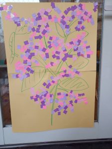 【6月】自由遊びの時間を使って製作をしました。色とりどりの貼り絵は、水曜・木曜クラス合同の「紫陽花」です。きれいだねー、かわいいね、この部分にお花つけたい、など話しながら、こんなに美しく貼ってくれました。葉っぱがなんだか違ってるのは教師の画力不足なので…あしからず(笑)